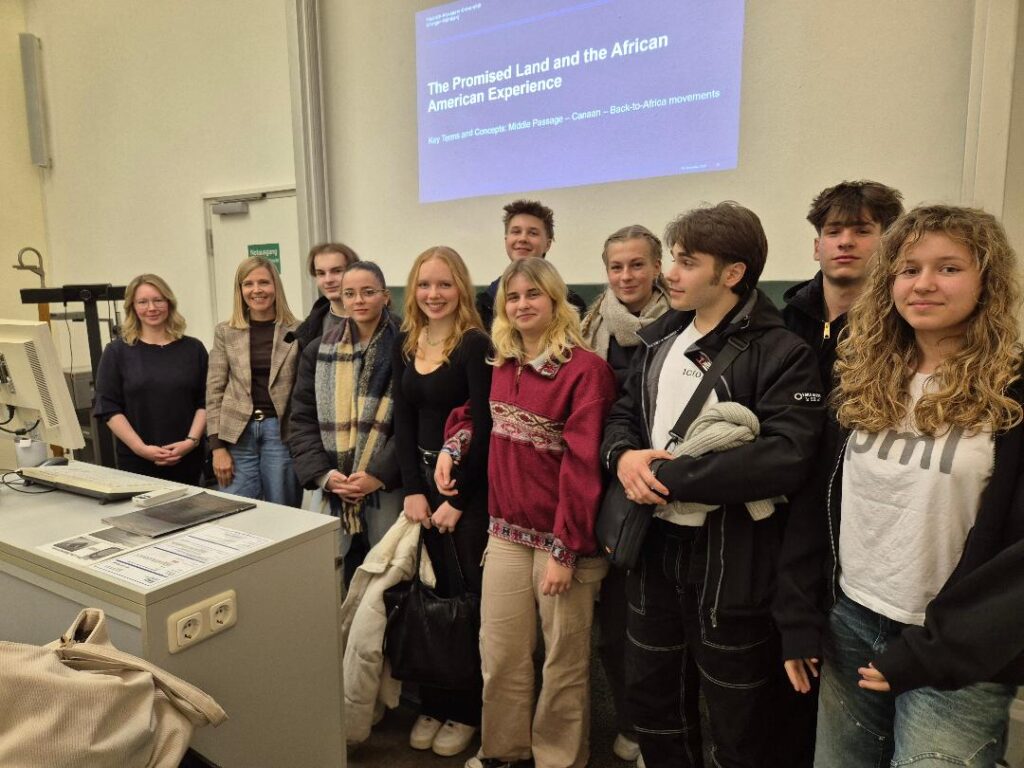 Die Q12-Schülerinnen und Schüler besuchten dort eine reguläre Sitzung des Lektürekurses American Civilization, geleitet von Frau Dr. Isabel Kalous. Auf dem Stundenplan stand das faszinierende und anspruchsvolle Thema The Promised Land and the African American Experience.