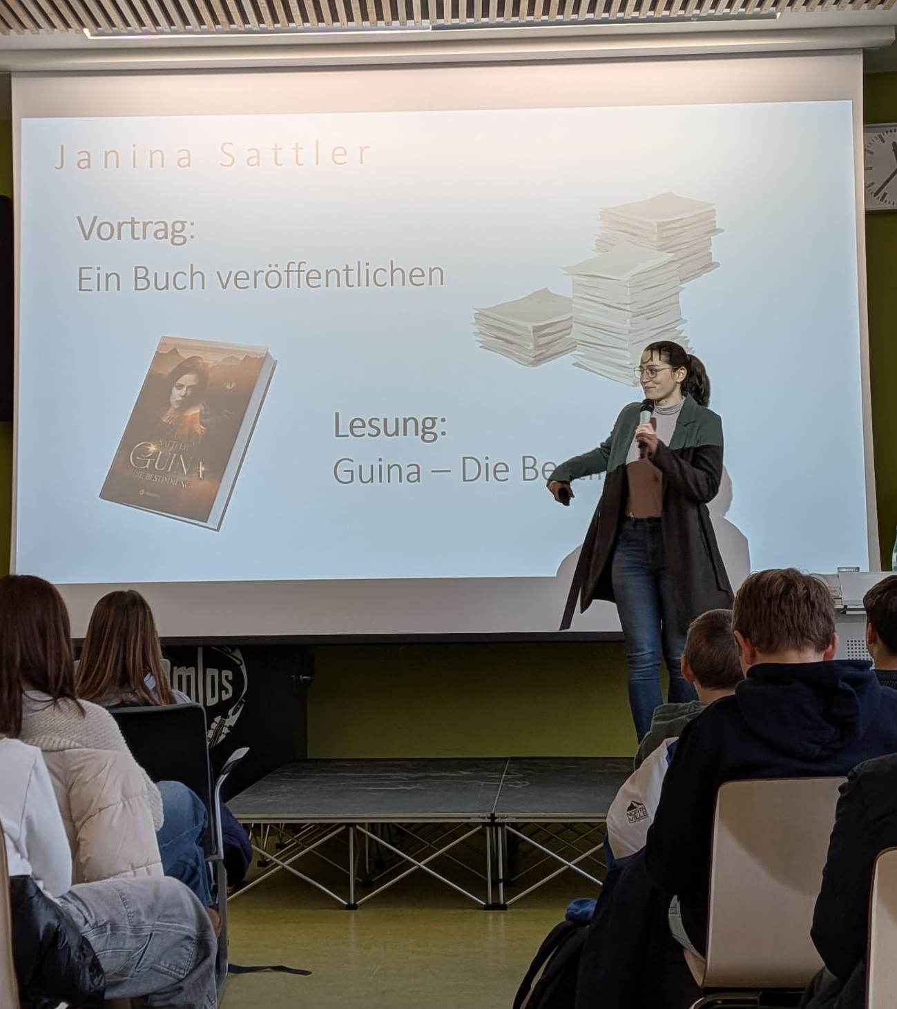 Am Dienstag, 02.12.25 las die Münchner Autorin Janina Sattler aus ihrem Buch ´Guina – Die Bestimmung` (erschienen am 7.10.2022) für die siebte Jahrgangsstufe. Den Schülerinnen und Schülern gefiel besonders, dass sie zunächst anhand einer Präsentation Einblicke in den Prozess von der Idee über das Schreiben bis hin zur Veröffentlichung gegeben hatte. Durch Fragen ans Publikum bezog Frau Sattler die Jugendlichen in ihren Vortrag mit ein – sie beantwortete aber auch Fragen, z.B. wie viel man damit verdient. Nach einer kurzen Pause las sie dann vier Stellen aus ihrem Urban Fantasy Roman aus München und Umgebung. Es geht um die Gestaltwandlerin Guina, die einerseits ihr Geheimnis vor den Menschen hüten muss, andererseits aber versucht ihrer entdeckten Bestimmung gerecht zu werden: Freundschaft mit einem Menschen zu schließen. Den Schülerinnen und Schülern fiel dabei die Nähe zu Katja Brandis ´Woodwalkers` auf, deren Reihe allerdings erst 2024 erschienen ist.