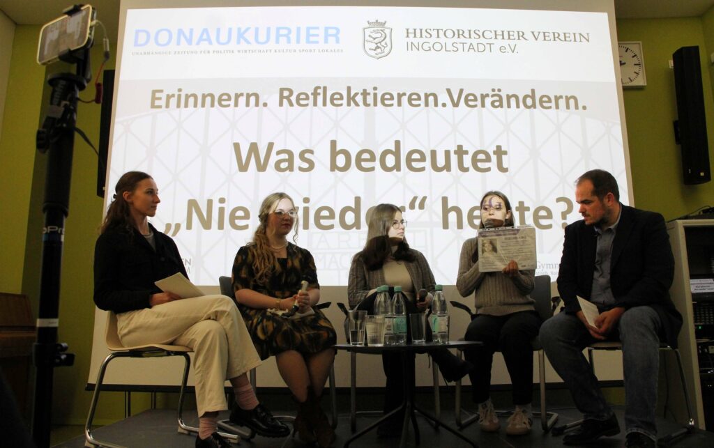 Abends am 30.09.2025 moderierten Marie Campisi und Marco Schneider vom Donaukurier an unserer Schule ein Podiumsgespräch unter dem Motto „Was bedeutet „Nie wieder“ heute?“ in Anbetracht der schwindenden Zeitzeugen. Auf dem Podium saßen die Schülerinnen Viktoria Utschick und Christiane Mayer vom Reuchlin-Gymnasium sowie Annika Heckl vom benachbarten Katharinen-Gymnasium.