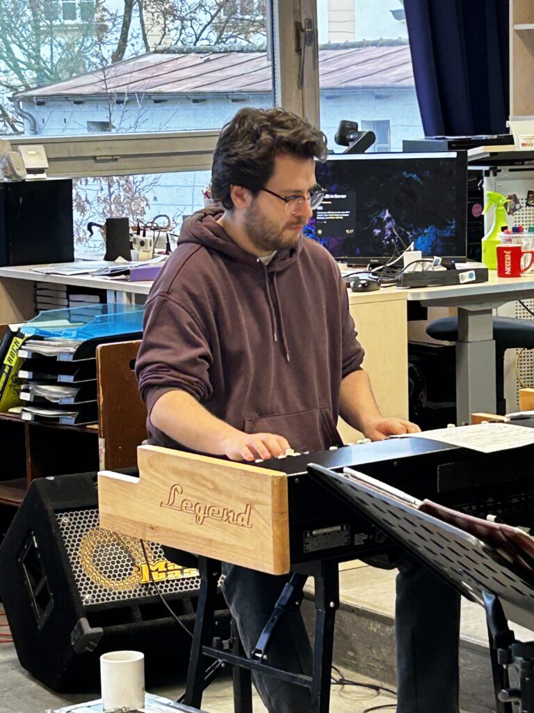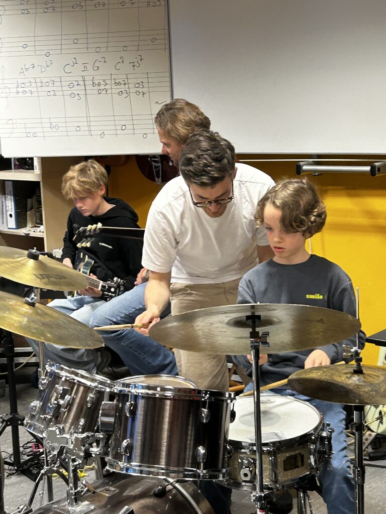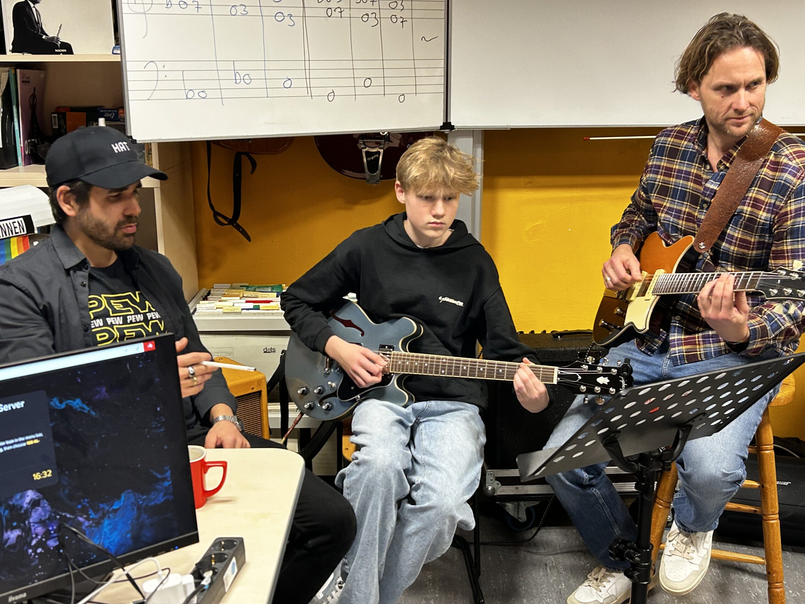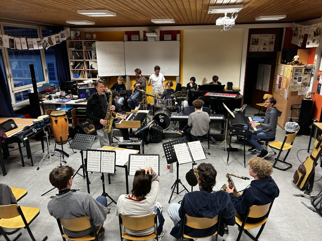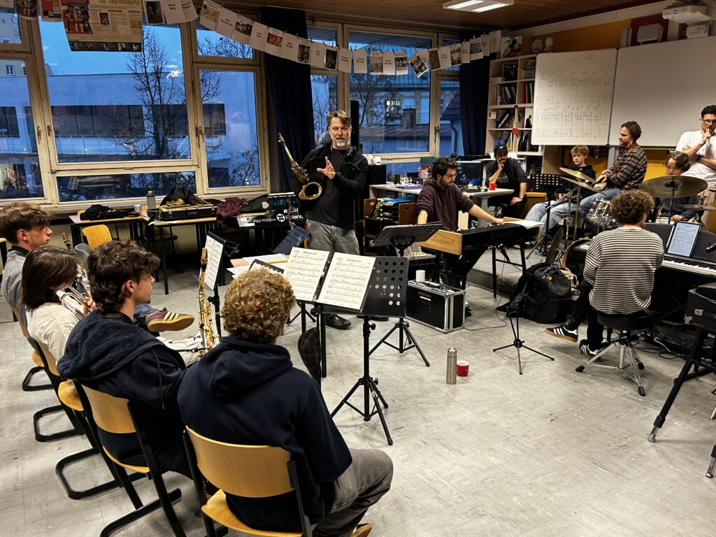 Eine Meisterklasse mit zwei WDR-Jazzpreisträgern am 10.12. nachmittags am Reuchlin-Gymnasium, es fühlte sich an wie ein vorgezogenes Weihnachtsgeschenk für 10 ausgewählte Schüler:innen aus dem Reuchlin-, Gnadenthal-, Descartes- und Gabrieli-Gymnasium, denn Heiner Schmitz (deutschlandweit bekannt als Arrangeur, Komponist und Tenorsaxofonist) und Simon Oslender (international agierender Hammond-Orgel Spieler) zeigten drei Stunden lang zusammen mit ihrem Jazzquartett, wie man Weihnachtslieder auf Jazz dreht. Begeisterung auf beiden Seiten, denn auch die vier Dozenten (mit Alexander Lipan, Gitarre und Alex Parzhuber, Drums) zeigten sich verblüfft über die professionelle Einstellung, das hörende Zusammenspiel und die Improvisationsfreude der Teilnehmenden.